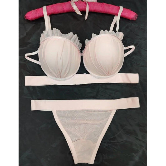 Lunelle Ekru Transparan Fırfır Detaylı Büstiyer Sütyen ve Tanga Külot Kadın İç Giyim Takımı