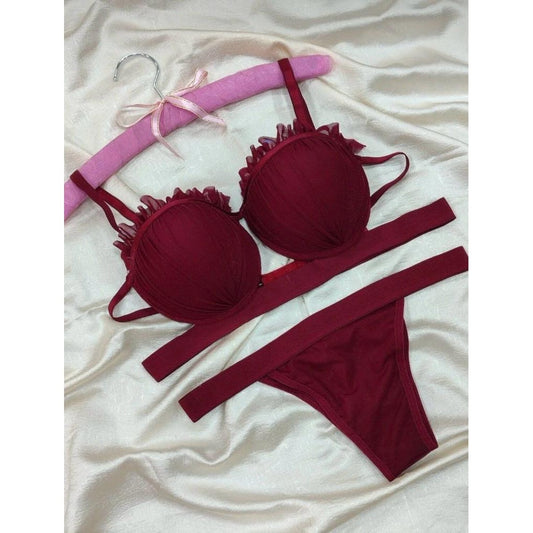 Lunelle Bordo Transparan Fırfır Detaylı Büstiyer Sütyen ve Tanga Külot Kadın İç Giyim Takımı