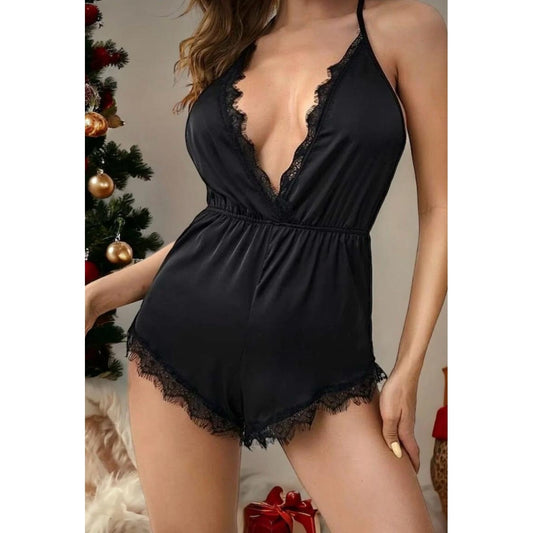 Lunelle Siyah Saten Dantel Detaylı Sırt Dekolteli Şort Tulum – Askılı Seksi Kadın Gecelik