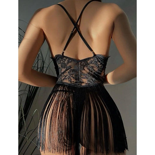 Lunelle Siyah Püskül Detaylı Dantel Babydoll – Sırt Dekolteli Fantezi Kadın İç Giyim